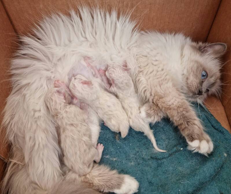 Hoera! Op 2 juni is onze Belina voor de eerste keer moeder geworden, en onze Brahma voor het eerst vader! De bevalling ging voorspoedig en Belina is een heel goede moeder. Er zijn 3 kittens geboren, 2 poesjes en één katertje.